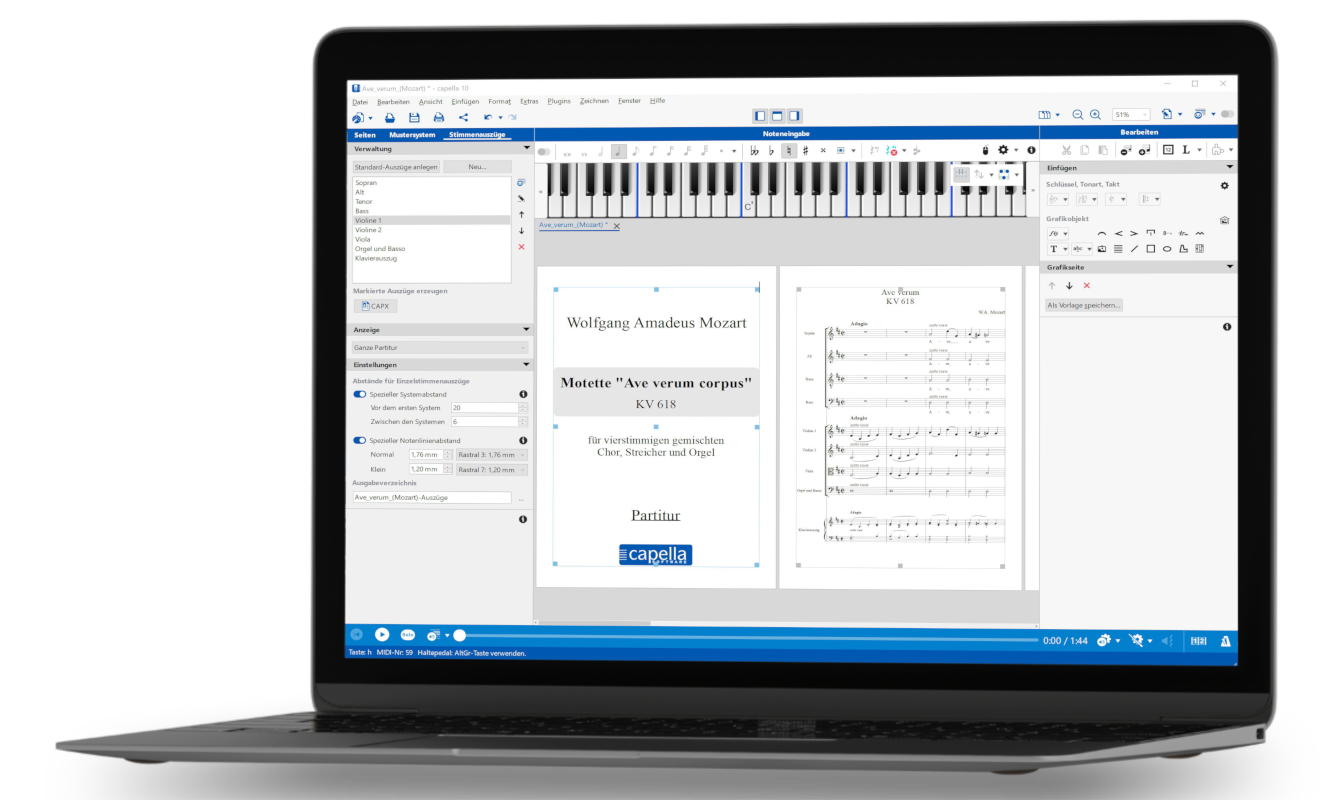 Noten für mein Ensemble schreiben mit dem komfortablen Stimmenauszug und den Grafikseiten. Professionelle Klangerzeugung mit VST3.