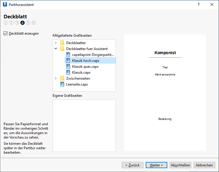 Im Partiturassistenten gibt es einen weiteren Schritt: Eine Grafikseite – die Neuerung in capella 10 – kann jetzt auch direkt hier als Deckblatt eingesetzt werden.