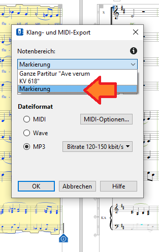 Beim MIDI- und Klangexport können jetzt Ausschnitte gewählt werden. Auf Wunsch wird das ganze Werk oder nur der markierte Bereich exportiert.